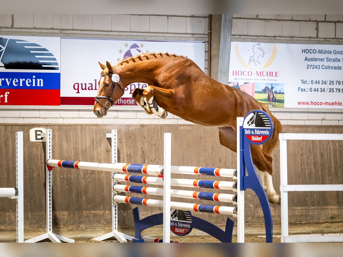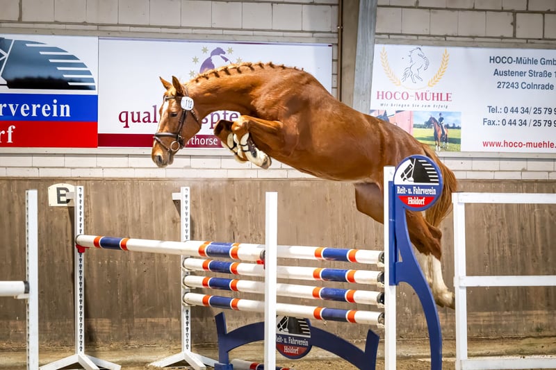 German Sport Horse for Sale – Perfect for Ambitious Riders! We are offering a beautiful chestnut gelding, born in 2022. With an impressive height of 173 cm, he is still growing. He is already backed and has proven to be very well-behaved, fearless, and eager to learn. With the right attitude and sufficient talent, he is suitable for both amateurs and professionals. He comes directly from the breeder and has grown up with a herd. Please feel free to contact me for more information or if you are interested. A visit can be arranged by appointment.
