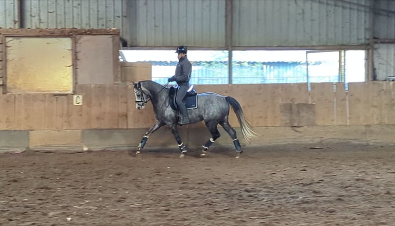 Für diejenigen, die etwas Besonderes suchen Ein äußerst angenehmer, fein bewegender Wallach, 1,63 / 1,64 m groß, kompakt gebaut – das ideale Damenpferd / Übergangspferd vom Pony zum Pferd, um in der Dressur zu glänzen. Sein Vater ist der deutsche Zuchtstamm des Shagya-Hengstes Basalt R, seine Mutter ist vollblütig deutsches Warmblut mit Abstammung von Quarterback (v. Quarterman Brand) x Wolkentanz I. Er ist sehr angenehm zu reiten, hat viel Bewegungsfreude, viel Schwung und Ausdruck. Momentan hat er seine erste L-Dressur absolviert, wir arbeiten an der Verfeinerung und üben gerade einige M-Übungen. Außerdem zeigt er eine gute Springanlage und springt eine kleine Parcoursrunde von ca. 70 cm. Unser Fokus liegt momentan hauptsächlich auf Dressur, daher beschäftigen wir uns weniger mit dem Springen. Ausritte in der Natur liebt er ebenfalls und hat keine Angst vor dem Verkehr, der hier vorbeifährt. Charakterlich ist er ehrlich und freundlich, stets motiviert, etwas zu tun. Besichtigung in Wijk und Aalburg möglich. Alle (Re-)Prüfungen erlaubt.