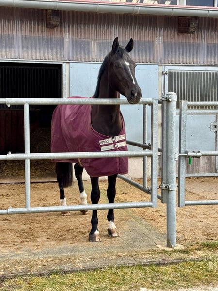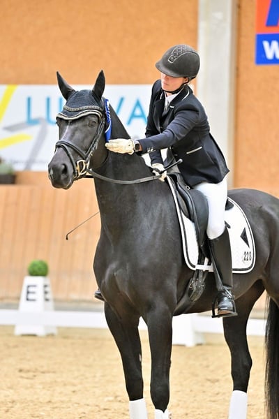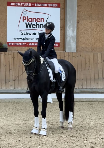 Dieser wunderschöne Rappwallach sucht ein Zuhause, in dem er weiter gefördert und geliebt wird. Ein Pferd, dass man einfach gern aus der Box holt: ehrlich, brav, sehr lernwillig und mit genug Sensibilität sowie gesundem Go, um später auch schwerere Lektionen zu erlernen. Bereits 4-jährig ist er mit 7,8 in einer Dressurpferde A platziert. Über den Winter wird er ruhig Richtung L-Niveau weitergebildet – erste Ansätze zeigt er bereits. Was ihn besonders macht • echtes Herzenspferd ohne Unarten • schmiede- und verladefromm • regulierbares Go, keinerlei Bocken/Steigen • sehr feines Reitgefühl und sitzbequem • aufmerksam, kooperativ, möchte immer alles richtig machen Videos und Probereiten sind auf Anfrage möglich. Um Reittourismus auf diesem jungen Pferd zu vermeiden, berechnen wir eine 50€-Gebühr, die bei Kauf selbstverständlich verrechnet wird. Ein Standard-Röntgentüv ohne Risikobefunde (Frühjahr 2025) liegt vor. Anfragen bitte über WhatsApp: +49 151 10699165