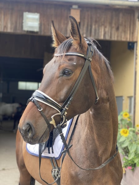 **Sales Advertisement: German Sport Horse** For sale is an impressive German Sport Horse gelding from the year 2020. With a height of approximately 175 cm and his elegant brown coloring, he attracts all attention. This talented gelding is particularly suitable for dressage and already shows promising approaches in his training. His movements are smooth, expressive, and energetic, making him a promising partner for ambitious riders. He is well-mannered, well-educated, and always calm. He consistently demonstrates a high willingness to perform and joy in his work. He is not spooky and very well-behaved in handling. A clean radiographic examination with 18 images is available. If you are interested or need further information, please feel free to contact me. 017634157623