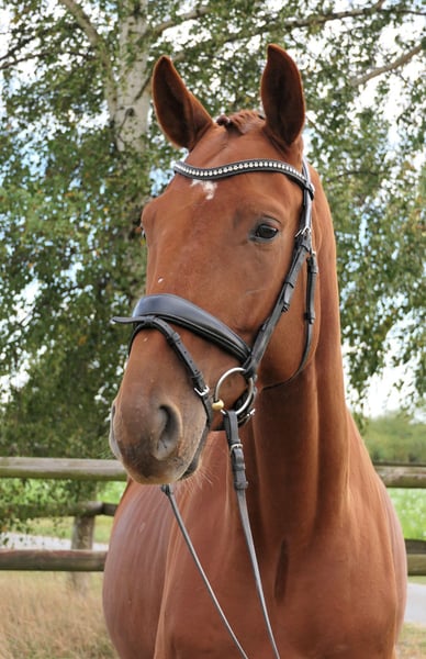 From loving upbringing, a handsome, large-framed chestnut gelding by Belantis II is for sale. This young gelding impresses not only with his expressive appearance and lovable personality but also with his rideability and willingness to learn. He is motivated under saddle, responds delicately to aids, and has three good basic gaits. Healthy, with recent good X-rays, ready for further training.
