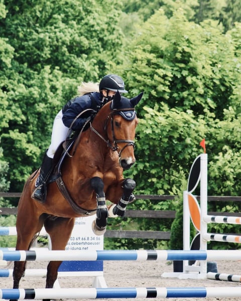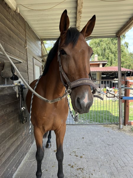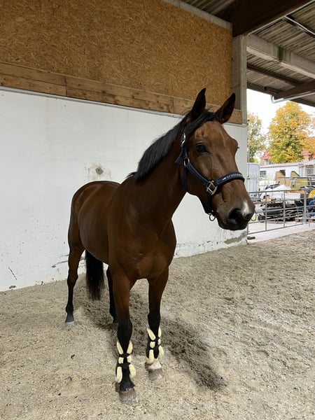 For sale is a 5-year-old gelding by Cheetano (Coriano x Capitol II) with a height of 166 cm. Charlie started his first show jumping test at class A in April of this year and was able to place immediately. He has been successful in show jumping A* and has been presented in show jumping A**. In the course, he shows himself to be eager to perform, brave, and with good overview – when he receives the necessary confidence from the rider, he jumps everything. He is light to ride. Due to his pedigree, he may also be interesting for dressage. In daily handling, Charlie is sweet and sensitive and, due to his age, is not a pure beginner's horse. He needs an empathetic, patient person who provides him with consistent guidance and takes their time. Then he shows himself to be very cooperative and willing to perform. He is naturally shoe-friendly and loading-friendly, knows trail riding both alone and in a group. No known health deficiencies. A vet check from 12/24 is available, including X-rays. Videos and competition name available upon request. He is offered exclusively to loving, supportive hands.