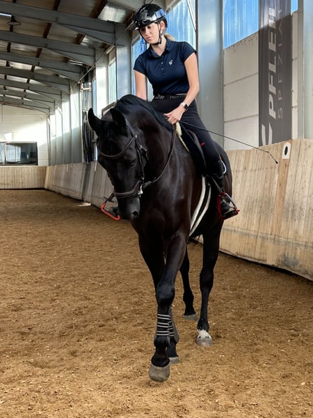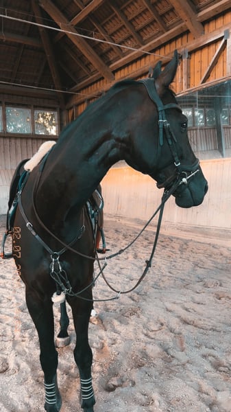 Wunderschöner, sensibler aber stets braver Wallach, der seinem Reiter immer gefallen möchte. Er arbeitet sehr gerne mit und zeigt sich motiviert und lernwillig. Aufgrund seiner Sensibilität ist er kein Anfänger- oder Wiedereinsteigerpferd, aber für einen feinfühligen, konsequenten Reiter ein absoluter Rohdiamant. Beim Springen ist er noch unerfahren und zeigt sich eher guckig, weshalb er für mich persönlich nicht das passende Pferd für diese Disziplin ist.