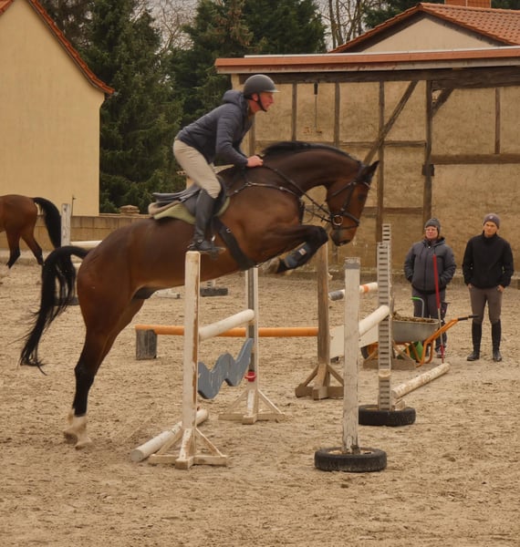 For sale: German sport horse gelding – born in 2019 We are offering an elegant and versatile German sport horse gelding. Born in 2019, he impresses with an excellent pedigree. Standing at 173 cm (16.1 hh), he is a true talent in both dressage and show jumping. This dark bay gelding exhibits a balanced and eager-to-learn nature, is well-trained, and has a solid basic education. He was backed at age 4 and, after a few competition starts, spent the second half of summer on pasture. At ages 5 and 6, he competed appropriately in L and M classes, achieving several placings. He also convinced in the dressage arena, placing in a dressage riding horse class of A-level. His pleasant temperament makes him very even-tempered in handling; he is not spooky or overly curious. Thanks to his excellent riding qualities and character, he is suitable for ambitious leisure riders as well as for competitive sport. Please feel free to contact me for further information or if you are interested. Viewing and trial rides are possible by arrangement.