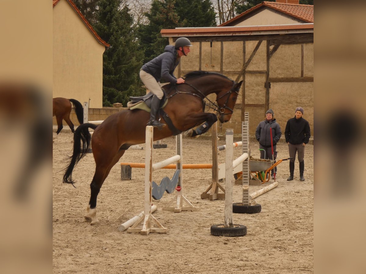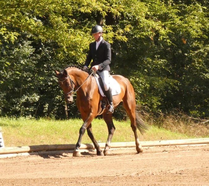 For sale: German sport horse gelding – born in 2019 We are offering an elegant and versatile German sport horse gelding. Born in 2019, he impresses with an excellent pedigree. Standing at 173 cm (16.1 hh), he is a true talent in both dressage and show jumping. This dark bay gelding exhibits a balanced and eager-to-learn nature, is well-trained, and has a solid basic education. He was backed at age 4 and, after a few competition starts, spent the second half of summer on pasture. At ages 5 and 6, he competed appropriately in L and M classes, achieving several placings. He also convinced in the dressage arena, placing in a dressage riding horse class of A-level. His pleasant temperament makes him very even-tempered in handling; he is not spooky or overly curious. Thanks to his excellent riding qualities and character, he is suitable for ambitious leisure riders as well as for competitive sport. Please feel free to contact me for further information or if you are interested. Viewing and trial rides are possible by arrangement.