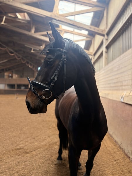 We are offering this handsome dark bay gelding for sale. He is 8 years old and has three very good basic gaits. He is very gentle in handling and gets along excellently with other horses. Under saddle, he is always motivated and eager to learn, but he requires a calm, sensitive rider. He enjoys hacking out – alone as well as in a group, though he prefers being in a herd. From the ground, he is also very responsive and truly enjoys building a bond with his handler. We are looking for a home where he can settle in and receive undivided attention. We could also see him well in an open stable setting. Of course, he is farrier-friendly and has never been lame during his time with us. He is regularly treated by a physiotherapist. Videos are available upon request. We look forward to hearing from you and are happy to answer any questions at any time.