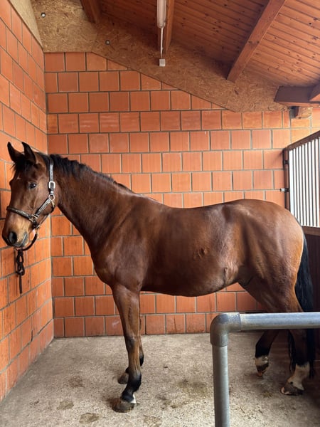Sportwallach | 8 Jahre | ca. 175 cm | von Valerio x Lordanos Van Helsing, auch Valdanos genannt ist ein super verschmustes Sportpferd mit einem sehr ausgeprägten Lerndrang, welcher seit August 2023 in unserem Besitz ist. Er besitzt drei schwungvolle Grundgangarten und einen tollen Sprung, ohne Verweigerungen. Außerdem ist er ein aktives Pferd, was sich gerne bewegen möchte. Er ist super geeignet für Ambitionierte Reiter und wird auch in hohen Springklassen nicht enttäuschen. Im Gelände und neuen Umgebungen zeigt er sich unerschrocken und sicher, angst vor etwas hatte er bisher noch nie. Valdanos braucht jemanden der ihm täglich Abwechslung und Bewegung ermöglicht, damit er konzentriert und gelassen mitarbeitet. Für Anfänger, ist er nicht geeignet, da er einen unerschrockenen Reiter braucht, auf den er sich verlassen kann und der sich ggf. auch durchsetzt. Außerdem ist er mit "Gefühl" zu Reiten, also keine großen Krafteinwirkungen. Er wurde von der Vorbesitzerin bereits auf Turnier vorgestellt und konnte dort auch überzeugen. Er ist ein extrem verträgliches Pferd und hat sich bisher mit jedem Pferd verstanden, er steht in der Rangordnung recht mittig. Grundsätzlich ist er sehr verspielt sowohl mit Pferden, als auch mit Menschen, er kennt aber seine Grenzen. Sein Zubehör (Angepasster Sattel im sehr guten Zustand, Trense und alles was man so braucht) kann gegen einen Aufpreis mit gekauft werden. Geplant war, dass er für immer bei uns bleibt, was wir aber leider Zeitlich und unseren Umständen entsprechend nicht mehr gewährleisten können. Wir wünschen uns das er jemanden findet, der ihn weiter fördert und mehr Zeit für ihn hat. Gerne per Mail, oder WhatsApp melden, es werden alle Fragen beantwortet und gerne auch mehr Bilder und Videos gezeigt. talisa.juelke@gmail.com +49 176 55914887