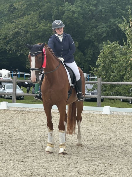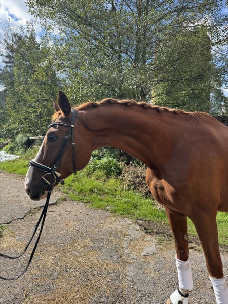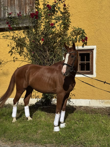 Bernstein (von uns Börni genannt) ist ein schicker Fuchswallach, der 2016 geboren ist - DSP-Beradini/Boston/Jazz. Er hat ein Stockmass von 1,75 und 3 gute, leichtfüssige Grundgangarten. Börni wurde bereits platziert und siegreich in A und L Aufgaben vorgestellt. Er wird solide ausgebildet und wird bei weiterer Arbeit sicherlich ein toller Partner für höhere Dressur werden. Er kennt Cavaletti und Stangenarbeit und ist auch schon kleinere Pacourauschnitte bis 100cm gesprungen. Aufgrund seiner Arbeits- einstellung macht ihm dies auch Spass. Ein Ritt ins Gelände stellt kein Problem dar. Allerdings ist er kein Anfängerpferd und braucht einen sicheren Reiter. Im Umgang ist er super brav, kennt Kinder, Hunde, Traktoren und grössere Gerätschaften, da er auf einem landwirtschaftlichen Betrieb steht. Er steht bei uns 24/7 auf der Weide (wenn es das Wetter zulässt) ansonsten ist er Boxenhaltung gewöhnt. Wir würden uns allerdings einen Platz mit viel Weide wünschen, da er einfach ausgeglichener ist und gerne mit seinen Artgenossen Zeit verbringt und im Herdenverband auch gemischt sehr verträglich ist. Wir wünschen uns für Börni ein liebevolles Zuhause an dem seine Fähigkeiten und Fertigkeiten weiter gefördert werden. Probereiten ist nach Vereinbarung jederzeit möglich!