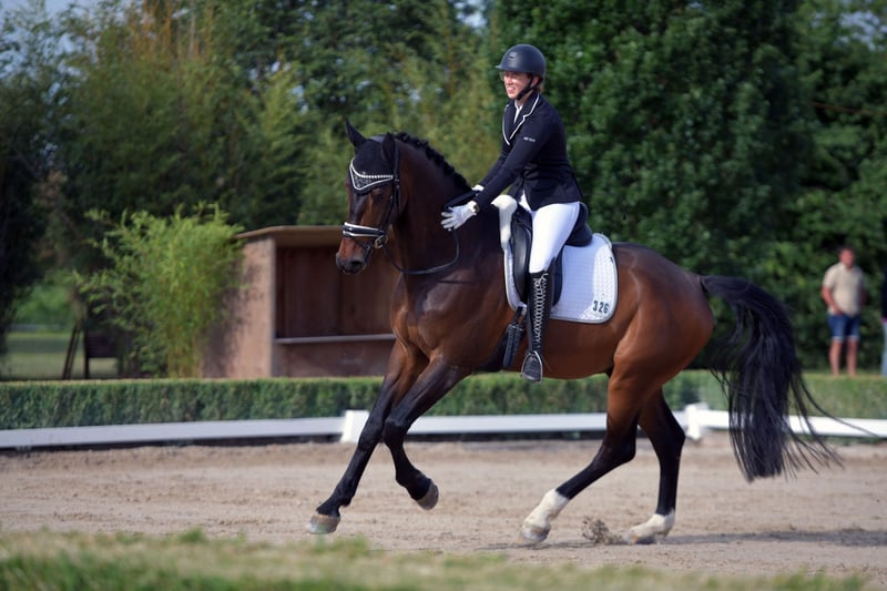 Valentino M (9 lat, 1,78 m, Vitalis x Ehrentusch) to absolut spokojny i zrównoważony partner. Niezależnie od tego, czy chodzi o ujeżdżenie, małe skoki, wyjazdy na teren, solo czy w grupie – zawsze sprawia radość. Tino jest bardzo przywiązany do ludzi i naprawdę lubi się przytulać. Zna pracę na ziemi i z fasciami, reaguje na nią bardzo delikatnie i wrażliwie. Jest wytrenowany do poziomu klasy A w ujeżdżeniu, ale potrafi też skakać przez przeszkody, zna galop zewnętrzny i zmiany nóg. Z odrobiną cierpliwości można go również dalej rozwijać. Obecnie mieszka w stajni otwartej, co bardzo mu służy, szczególnie ze względu na PSSM2 (od trzech lat bez zaostrzeń). Dzięki suplementom i odpowiedniemu treningowi jest dobrze zarządzany. Niestety, nie mogę mu tego zapewnić w Monachium, dlatego Tino mieszka obecnie u mojej trenerki w 85084 (w pobliżu Ingolstadt). Taki styl opieki i osoba, która pokocha go takim, jakim jest, byłaby dla niego idealna. Jest absolutnie spokojny podczas czyszczenia kopyt i załadunku. Zazwyczaj jeździłam na zawody sama, co również przebiegało bez problemu. Obecnie jest na kucyku.