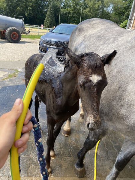 In beste Hände geben wir unsere Bella ab. Sie ist tragend für 2026 vom Landbeschäler Destano. Bella ist optisch etwas ganz Besonderes und besticht durch ihre enorme Bewegungsqualität. Im Umgang ist sie ein absoluter Schatz. Immer lieb und sozial verträglich. Bella hat ein Fohlen von FS Mr Right aus 2023. Die Stute wird demnächst angeritten und kann ebenfalls besichtigt werden. Bella nimmt leicht auf und die Geburt verlief absolut komplikationslos. Sie ist eine tolle Mutter und geht in dieser Rolle auf. Deswegen haben wir sie 2025 wieder besamen lassen. Wir haben Bella seit 2017 und Sie war nie lahm oder krank. Bella kann auch geritten werden, hier benötigt sie aber einen ruhigen und sicheren Reiter, da sie beim Reiten sehr sensibel ist. Bella wurde einmal Dressurpferde A vorgestellt. Die Prüfung beendete sie mit einer 7,2. Auf dem Turnier und auch auf der Fohlenschau zeigte sie sich selbstbewusst und unkompliziert. Bella ist Westfälische Verbandsprämienstute. Wir geben sie nur aufgrund unserer zahlreichen Nachzucht ab und nur in beste Hände.
