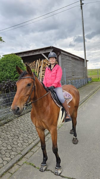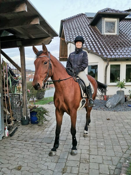 Buscamos un nuevo hogar para nuestra yegua de 10 años, Maki (Lifedream S), ya que por motivos de salud nos vemos en la necesidad de separarnos de ella. Maki es un caballo de deporte alemán (padre: Lord Noble S; abuelo materno: Fashion S) con un porte elegante y mide aproximadamente 1,66 m de altura. Es un caballo muy carácter fuerte y seguro de sí mismo, por lo que no se deja alterar por influencias del entorno. Solo en el manejo a veces muestra cierta desconfianza y prueba sus límites. Por ello, no es apta para principiantes. En otros momentos, sin embargo, es una yegua muy cariñosa y mansa. En la pista y en el paddock no ha sido montada con frecuencia (solo en tracción), ya que a veces presenta dificultades en giros cerrados. Estas molestias se deben a estados temporales de dolor que, tras varias sesiones con el osteópata y también con el veterinario, aún no han podido localizarse con precisión. En su pata delantera izquierda tiene una pequeña desviación debido a un accidente en el pasto. Maki está familiarizada con el establo en paddock con otros caballos, con la cuerda de conducción, el cuidado de cascos y el transporte en remolque. Cuenta con un pasaporte de equino que incluye tratamientos regulares y todas las vacunas necesarias. La aptitud para montar debería ser reevaluada. La última vez que fue montada fue a mediados de agosto. También podría desempeñar un papel en la reproducción o simplemente mantenerse como caballo de compañía. ¡Venta solo con contrato de protección! ¡Antes el bienestar que el precio!