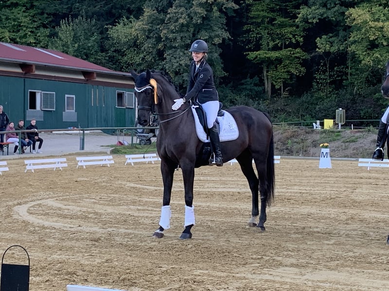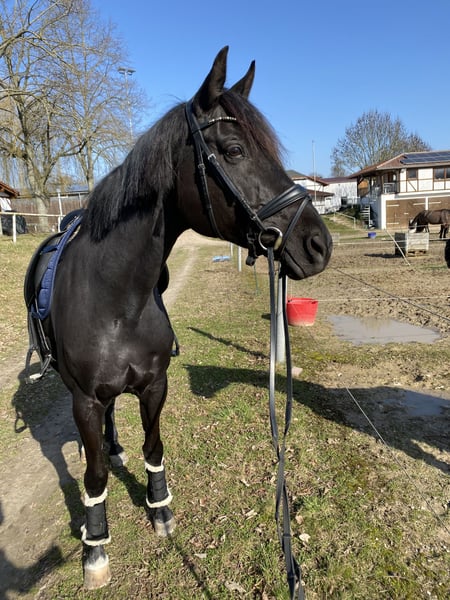 Wunderschönes Mädchenpferd sucht Bestplatz Zum Verkauf steht eine wunderschöne menschenbezogene 11 jährige Rappstute. Im Umgang super brav und zuletzt auch von einem 13 jährigen Mädchen mitgeritten. Glücklicherweise hat sie kein stutiges Verhalten im Umgang. Beim reiten ist sie mit genügend Go ausgestattet, hat aber noch nie einen Reiter verloren. Daher nicht für ängstliche Reiter oder Anfänger geeignet. Sie war Seriensiegreich in Dressurprüfungen der Klasse L und L**. Sie hatte bereits 4 und 9 jährig zwei wundervolle Stutfohlen (darunter ein Warmblutfalbe). Daher auch für Züchter interessant. Bisher hat sie immer direkt beim ersten besamen aufgenommen, einen problemloses Abfohlen gehabt und war eine sehr fürsorgliche Mutterstute. Am liebsten möchte ich sie an einen Freizeitreiter abgeben, der ein gehobenes Freizeitpferd zum Spaß haben sucht. Wir sind wöchentlich ins Auswärtstraining gefahren, was keine Probleme dargestellt hat. Sie geht alleine als auch in der Gruppe ins Gelände. Auch hier hat sie genügend Go, ist aber immer händelbar. Im vergangenen Jahr hatte Elise eine Hufgelenk OP und ist seit dem auf Barhuf umgestellt und wieder im Training. Die OP lieferte allerdings keinen Befund. Bzgl. der gesundheitlichen Details gebe ich gerne bei erstem Interesse weitere Auskunft. Sie liebt Bodenarbeit und begrüßt ihre Bezugsperson täglich mit einem Wiehren. Ich wünsche mir ein 5-Sterne zu Hause mit täglichem Koppelgang als Endplatz für sie. Bei mir ist sie täglich den ganzen Tag draußen. Sie stand bereits in der Herde, zu zweit, als auch alleine. Bisher konnte sie sich mit allem arrangieren. Wenn du ein täglich motiviertes und sehr menschenbezogenes Pferd suchst, könnte Elise dein Traumpferd sein. Bei Interesse freuen wir uns Euch kennenzulernen.