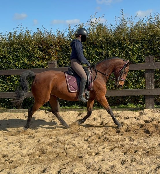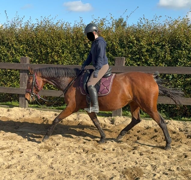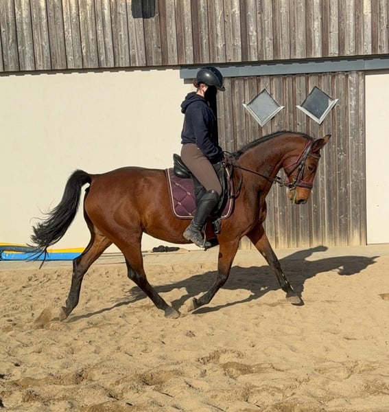 For sale is a German sport horse, a 17-year-old mare approximately 16.1 hh with full pedigree on her passport (Amantus x Korsine). She is in excellent condition and is currently being ridden regularly. She is easy to handle and shows a very calm and obedient demeanor during work. She moves softly into contact and has previously competed in sport. In handling, she is absolutely well-behaved and always manageable without issues. She is not spooky and remains relatively relaxed. No known illnesses or allergies. An ultrasound examination (AKU) can be performed upon request. A trial ride, pre-ride, or other testing of the horse costs €35. This amount will be credited towards the purchase if you decide to buy. Please call or send a message to 0157 36803742. All information is provided without guarantee. Prices are subject to change. Transport can be arranged, and online purchasing is possible.