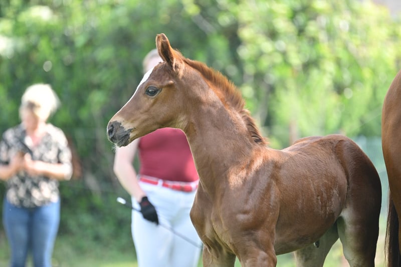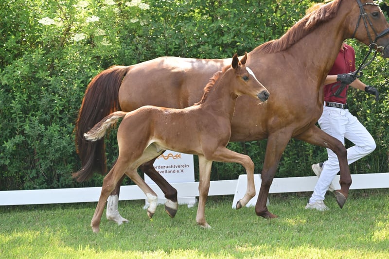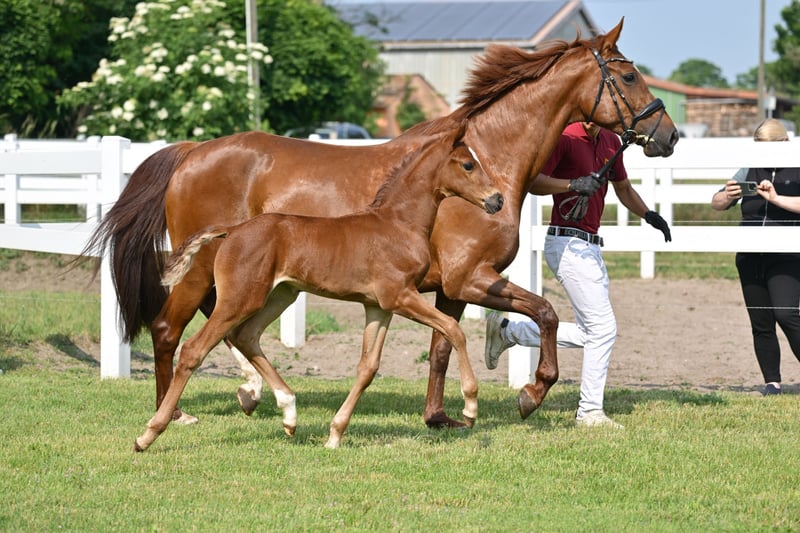 Zum Verkauf steht ein hochwertiges Dressur-Stutfohlen des Jahrgangs 2025 mit erstklassiger genetischer Ausstattung. Die dunkelfuchsfarbene Barletta B überzeugt durch einen modernen, eleganten Typ, viel Ausdruck sowie sehr gute Bewegungsanlagen. Bereits als Fohlen präsentiert sie sich mit natürlicher Balance, guter Schulterfreiheit und aktiver Hinterhand – Eigenschaften, die eine vielversprechende Perspektive für Dressursport und Zucht erkennen lassen. Auf der Fohlenschau erhielt Barletta B Höchstnoten und wurde ausgezeichnet als Prämien- und Championatsfohlen. Abstammung Vater: Bonds Bonds zählt zu den führenden Dressurnachwuchsvererbern Deutschlands und führt die FN-Zuchtwertschätzung an. Er war selbst Körsieger, HLP-Sieger und ist S-Dressur erfolgreich. Seine Nachkommen überzeugen durch Typ, Rittigkeit und Bewegungsqualität; 2025 stellte er u. a. den DSP-Körsieger in München, der für 770.000 € versteigert wurde. Mutter: Florencia B Die Mutter ist Staatsprämienstute und Reservesiegerin ihrer Stutenleistungsprüfung. Florencia B gewann Bronze beim Verbandschampionat der 3jährigen Reitpferde. Sie überzeugt durch hervorragende Rittigkeits- und Bewegungswerte und entstammt einem bewährten Leistungsstamm mit erfolgreichen Sportpferden und gekörten Hengsten. Die Mutterlinie steht für Leistungsbereitschaft, Qualität und Verlässlichkeit in Sport und Zucht. Perspektive Barletta B ist eine ideale Offerte für: Dressurreiter mit Blick auf die Zukunft ambitionierte Züchter Käufer, die frühzeitig in Qualität investieren möchten Weitere Informationen 📍 Standort: Schönwalde-Glien, Deutschland 📞 Bei Interesse oder für weitere Informationen kontaktieren Sie uns gern per WhatsApp: +49 160 94418086