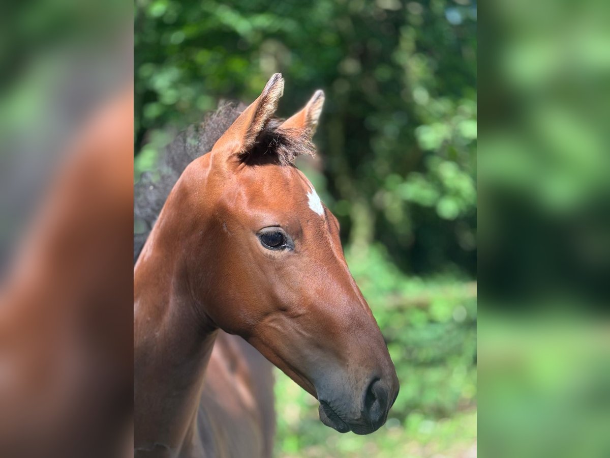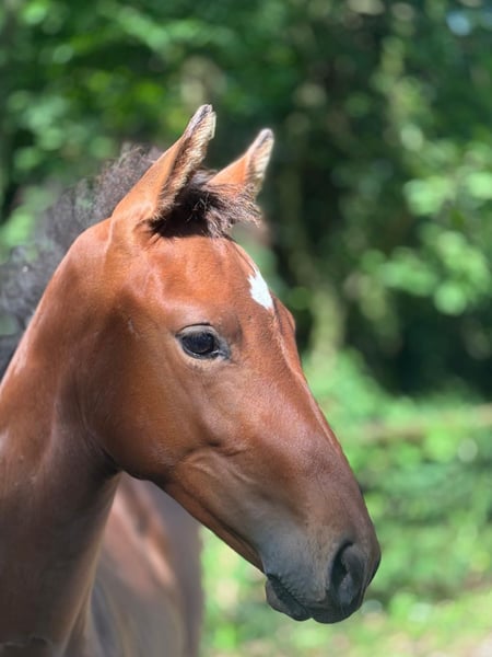 For Sale: German Sport Horse A promising mare born in 2025 is available. This chestnut beauty impresses not only with its attractive conformation but also with excellent genetics for show jumping. **Details:** - Breed: German Sport Horse - Sex: Mare - Year of Birth: 2025 - Color: Chestnut - Suitability: Jumping The mare captivates with her elegant expression and harmonious movement. She is well-behaved in handling and scored 8 in type, 7.5 in conformation, and 8 in movement at the foal inspection. If you are interested or require further information, please feel free to contact me. Don’t miss this opportunity to acquire a talented young horse for your sporting ambitions!