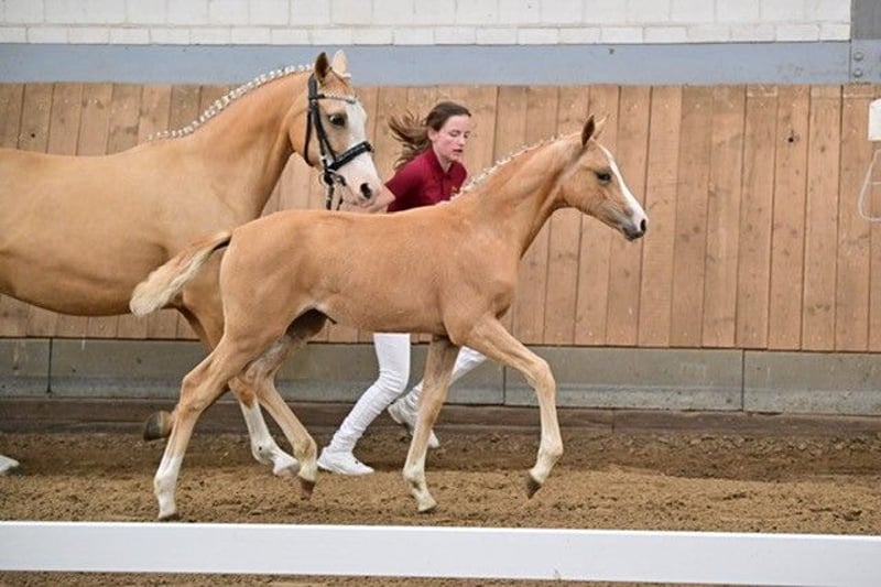 Name Cuba NL Date of birth 23.03.2024 Color Fuchsisabell (Palomino) Sire: Cooper County WE Dam: Charlette StPr Dam's sire: Charmeur Typey Brillantring filly Cuba NL not only impresses with her typey and elegant appearance, but also with very good movements and an impeccable character. Directly from the breeder, born with us and raised in a foal herd with lots of pasture. Regularly wormed, halter trained and farrier friendly. She knows the foal ABC. Her dam "Charlette" (state premium mare) has now brought her third foal in a row to the foal championships in the Brillantring with Cuba NL. Cuba NL leaves nothing to be desired, she has qualities in all directions and is almost certain to reach the final standard. We are only giving her away because her dam is still quite young and already in foal again and her big sister (S: Numero Uno) is already waiting in the wings. Dam and siblings can also be viewed. She could also stay with us for foal rearing if required.