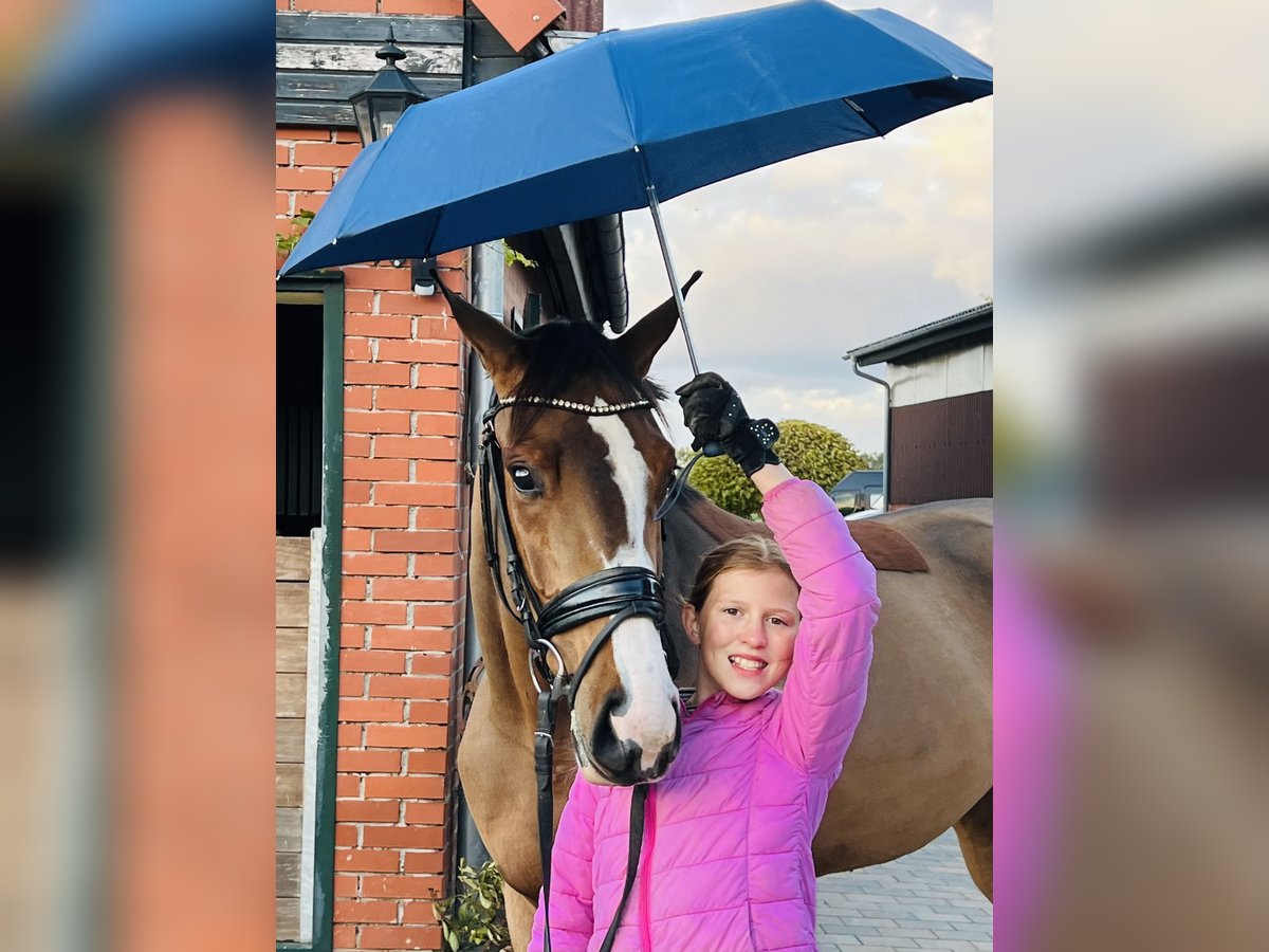 Unsere Stute „Sunflair“ (Rufname Sunny) ist 3,5 Jahre alt und hat derzeit ein Stockmaß von 1,65m. Ihr Vater „Sir Barver“ist ein hervorragender Dressurvererber v. Soliman de Hus x Rubinstein, der Rittigkeit und Charakter vererbt hat. Sunny’s Mutter ist eine rein springgezogene Stute v. Calvados x Zeus. Somit wurde Sunny bereits genetisch ein vielseitiges Talent in die Wiege gelegt. Sie wurde im Frühjahr dieses Jahres schonend angeritten. Sie hat von Anfang an unglaublich gut mitgearbeitet und wollte es ihrem Reiter immer Recht machen. Nach dem Anreiten durfte sie dementsprechend noch einmal den Sommer auf der Weide genießen. Vor wenigen Wochen haben wir sie erneut ins Training gebracht und sie macht täglich sehr gute Fortschritte. Sie ist absolut unerschrocken und anständig unter dem Sattel, hat ein ausgeglichenes Temperament und eine hervorzuhebende Leistungsbereitschaft. Sie bewältigt bereits kleine Sprünge mit gutem Überblick und kennt Ausreiten in der Gruppe und alleine. Sie erscheint als perfektes Amateurreitpferd für Jugendliche und Damen. Sie verleiht ihrem Reiter viel Sicherheit und ist daher auch für ängstliche Reiter (trotz ihres Alters) geeignet. Bei weiterer Ausbildung können wir uns auch vorstellen, dass sie eine interessante Hunter-Offerte werden könnte. Auch im Umgang ist sie menschenbezogen, stets freundlich und gut gelaunt. Sie hat einen sehr guten Tüv (mit Röntgenbildern vom Rücken) ohne Befund. Ein aussagekräftiges Video kann gerne per WhatsApp verschickt werden. Die Stute kann jederzeit nach Absprache ausprobiert werden. Für weitere Rückfragen stehen wir gerne zur Verfügung.