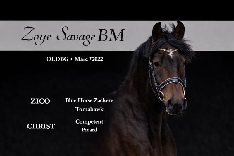Zoye Savage BM Oldenburg • Mare • Born 2023 For sale: an exceptional young mare with a modern type, excellent pedigree, and a very good temperament. Zoye Savage BM has already been backed, accepted her rider calmly, and has begun her groundwork and under-saddle training. Her pedigree provides a solid foundation for further sporting development: Zico – Blue Horse Zackere x Tomahawk Christ – Competent x Picard The mare is distinguished by: ✔ Very good movement mechanics and natural balance ✔ Flexibility and active hind leg work ✔ Calm demeanor and eagerness to work ✔ Quick learner ✔ Current veterinary checks available A very promising young horse for further dressage training – ready to continue her development under saddle. 📩 For more information and videos, please feel free to contact us.