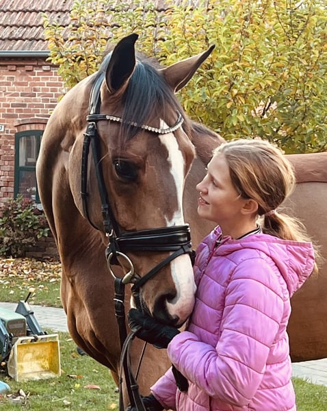 Our mare "Sunflair" (nickname Sunny) is 3.5 years old and currently measures 1.65 meters at the withers. Her sire, "Sir Barver," is an excellent dressage stallion by Soliman de Hus out of Rubinstein, known for passing on rideability and good character. Sunny’s dam is a pure show jumping bloodline mare by Calvados out of Zeus, making her a genetically versatile talent from the start. She was gently backed earlier this spring and has shown incredible willingness to work from the beginning, always striving to please her rider. After her initial training, she enjoyed a summer break on the pasture. A few weeks ago, we resumed her training, and she is making very good progress every day. She is absolutely fearless and well-behaved under saddle, with a balanced temperament and an outstanding willingness to perform. She already handles small jumps with good overview and is experienced in riding out in groups or alone. She appears to be an ideal amateur riding horse for young riders and ladies. She provides her rider with a lot of confidence and is suitable even for more nervous riders despite her age. With further training, she could also develop into an interesting hunter prospect. In handling, she is very people-oriented, always friendly and cheerful. She has a very good veterinary report (including X-rays of her back) with no findings. A detailed video can be sent via WhatsApp upon request. The mare can be tried out at any time by arrangement. Please feel free to contact us for further questions.