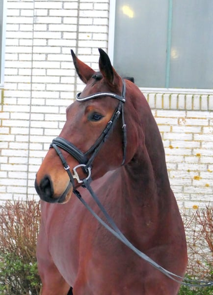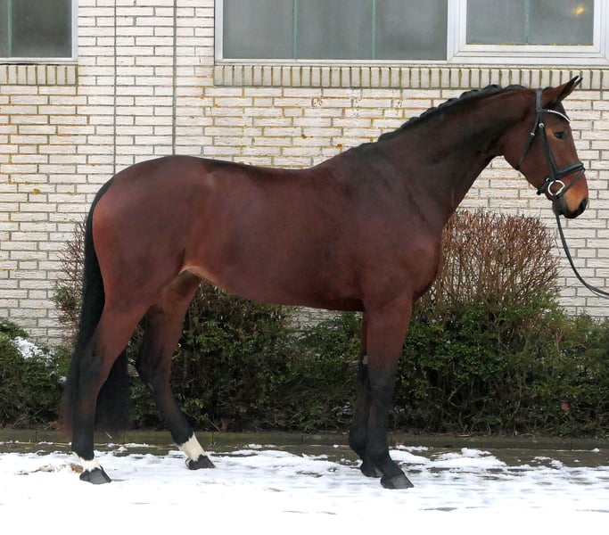 Dominga has everything everyone is looking for. Type, solid foundation, correct conformation, very gentle, easy to ride with a pleasant forward tendency. This young mare has been carefully prepared for her future tasks. After a brief break-in last year, she successfully completed her mare performance test and was awarded the State Premium. She then had the opportunity to grow calmly in the pasture and has been undergoing a versatile basic training for the past three months. She is well ridden, attentive, and possesses an excellent hind leg. Her walk is outstanding—generous, steady in rhythm, and consistently driven from the body. The trot impresses with activity and evenness, while her canter demonstrates a natural uphill tendency. She enjoys jumping small fences with great enthusiasm. Thanks to her open-minded nature, natural rideability, and eagerness to learn, she is ideally suited as a great partner for sport and/or leisure. She is uncomplicated and friendly in handling, familiar with both open stable and box (obviously with plenty of turnout), and gets along well in the herd. She is well-behaved for the farrier and loading, currently barefoot. Additionally, she has very good X-ray results. Her pedigree also makes her interesting as a broodmare. Sire Don Nobless was highly successful himself in the Grand Prix sport, as was her grandsire Foundation. Her grandmother produced several successful sport horses and was a full sister to the Grand Prix star Weinrausch. Dominga is still in the breeder’s ownership and can be visited at any time.