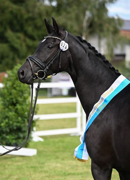 Zum Verkauf steht eine bildhübsche 4-jährige Rappstute, die nicht nur durch ihr edles Erscheinungsbild, sondern auch durch ihren tollen Charakter überzeugt. Sie wurde schonend angeritten und zeigt sich dabei stets unerschrocken, neugierig und lernwillig. Für ihr junges Alter ist sie bereits sehr schön ausbalanciert und verfügt über drei gute, sehr taktmäßige Grundgangarten. Aktuell befindet sie sich auf dem Ausbildungsstand Dressurpferde A und meistert diese Aufgaben sicher. Im Umgang ist sie absolut unkompliziert und angenehm, sodass sie auch für schwächere oder weniger erfahrene Reiter bestens geeignet ist. Ein echtes Traumpferd mit tollem Auge und viel Ausstrahlung – wie gemalt! Guter TÜV vorhanden