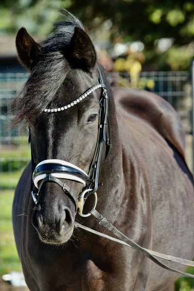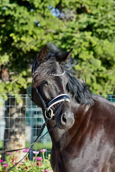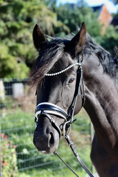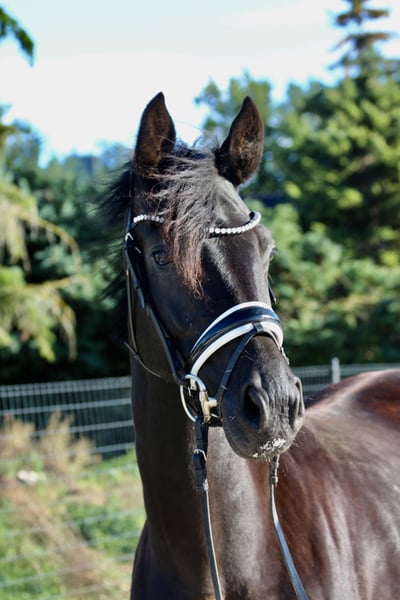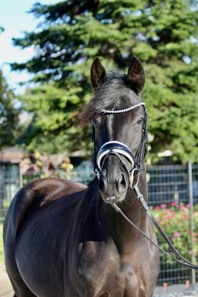 For sale is a promising young black mare with excellent potential, who shows motivation and commitment under saddle. Noteworthy are her very good basic gaits – especially her ground-covering walk. With energetic and expressive movements, she always remains clear-headed and demonstrates a willingness to move and learn. She has been gently started under saddle after having a foal this year and is currently in training as a riding horse. In handling as well as with other horses, she proves to have a lovable character and is always very people-oriented. The mare is currently kept in a paddock and has been regularly vaccinated, dewormed, and shod. Videos and further information and pictures available upon request.