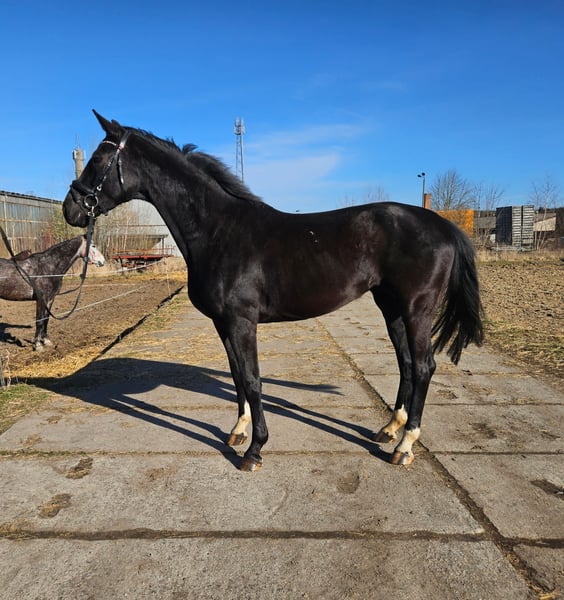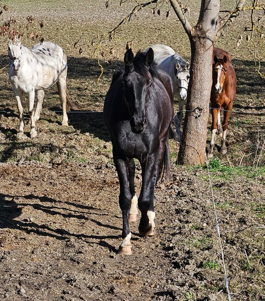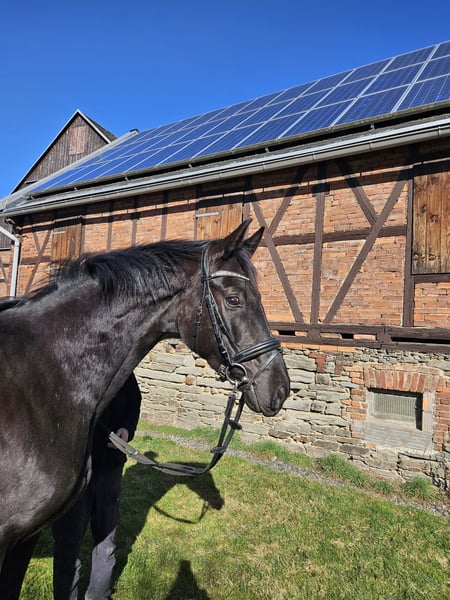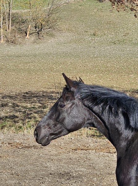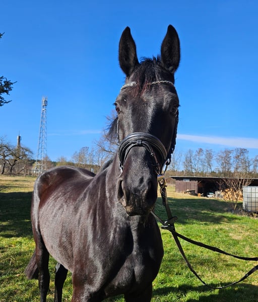 Zum Verkauf steht aus eigener Zucht diese wunderbare Rappstute aus der hocherfolgreichen Stutenfamilie der Nightfire gepaart mit dem fantastischen Vererber Shomari S. Sie hat 3 jährig eine sehr gute Stutenleistungsprüfung abgelegt. Insbesondere die Fremdreiternote von 8,5 belegt,dass es sich um eine sehr rittige Stute handelt, die zudem gepaart ist mit qualitätsvollen Grundgangarten und solidem Springtalent (bisher nur Freispringen).4 jährig wurde sie züchterisch genutzt und war Mama eines bewegungsstarken Hengstfohlens in Championatsqualität (26 Punkte). Aktuell befindet sie sich noch in ihrer Stutenherde (Nachts in einer separaten Box,tagsüber gemeinsam auf der Weide),da ihr Fohlen erst vor kurzem abgesetzt wurde ( es wurde erst im Juni 2025 geboren).Sie ist nicht wieder belegt worden, wird aber auch noch nicht wieder geritten, da das momentan zeitlich und personell schwierig zu organisieren ist.Bei ernsthaftem Kaufinteresse, findet sich aber sicher eine Lösung,Night Melodie wieder unter dem Sattel zu aktivieren. Sie war absolut unkompliziert unter dem Sattel,fleißig, gut händelbar,tolle Anlehnung,keine Unarten. Sie ist insgesamt ein sehr freundliches Pferd, was unheimlich gerne vom Menschen betüttelt wird.In der Herde ist sie sozial super verträglich und als eher rangniedrig einzustufen. Die Stute ist kerngesund,hat ein korrektes Fundament und große gesunde Hufe. Weiter Informationen gerne jederzeit telefonisch unter der 01714773611 . Die Fotos in der Annonce sind aktuell von letzter Woche,die Videos zeigen unter anderem Night Melodie als Fohlen,als Mama mit Fohlen und auch aktuell beim Freilaufen vergangene Woche.