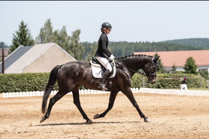 Na sprzedaż wystawiona jest klacz sportowa urodzona w 2019 roku. Ma jednostronną paraliż krtani, co powoduje charakterystyczny świst podczas oddychania. Dodatkowo cierpi na lekką astmę. Obie dolegliwości nie sprawiają jej większych problemów i nie wymaga leków. W tym roku startowała na konkursach do klasy L. Zauważyłam jednak, że intensywny trening jest dla niej zbyt obciążający. Szukam dla niej rekreacyjnego jeźdźca, który chętnie jeździ na teren i jednocześnie poszukuje konia do jazdy w zakresie rekreacji i dressage w stopniu A/L. Jest to dobrze wykształcona klacz, która sprawia dużo radości. Ma również wspaniały charakter i mimo młodego wieku zachowuje spokój. Obecnie jest pod kopytem przednim i stoi w mieszanej grupie, spędzając dzień na pastwisku, a noc w boksie. Z innymi końmi dogaduje się bez problemu. Po lekkim namowieniu chętnie się załadowuje, a podczas czyszczenia jest spokojna i posłuszna. Posiada dopasowany do niej uprząż do jazdy w stylu dressage, którą można również dokupić.