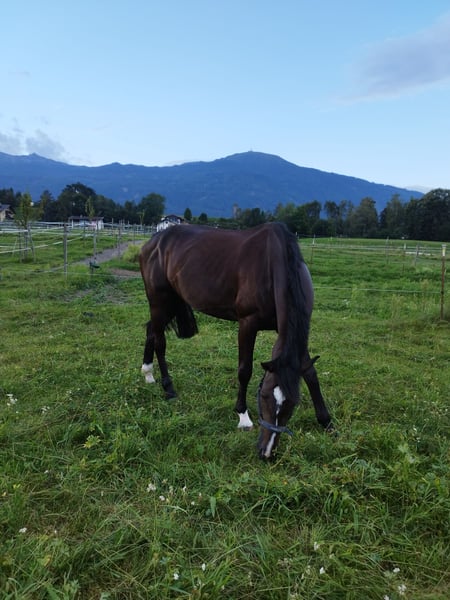 For family reasons, we are offering our personable and talented 7-year-old mare by Diatendro out of Clearline Z. After her foaling (a premium breeding mare with good scores and excellent conformation), she only came under saddle at nearly 6 years of age. She was gently introduced to basic gaits and has since competed at shows up to medium level. Currently, she is being trained to jump single fences up to 135 cm. She also has potential in dressage, but her main focus has been on show jumping. She is characterized by her high jumping ability, a clear head, and strong willingness to perform. Dia was directly purchased from the breeder and has never had negative experiences with people, making her very friendly and affectionate. She is well-behaved in the terrain, whether alone or in a group. Not an amateur horse, she requires an experienced rider with a steady hand. She has never been lame or ill, is load and farrier friendly (barefoot with very good hoof quality!), and has been regularly vaccinated and veterinary checked. Price negotiable for a good placement. Currently located at Hofgut Albführen, available from mid-January (earlier upon request). A-6071 Aldrans