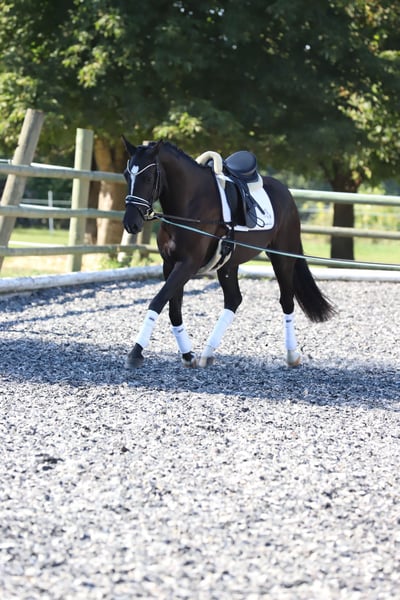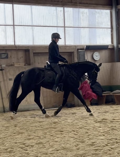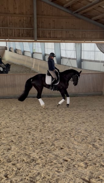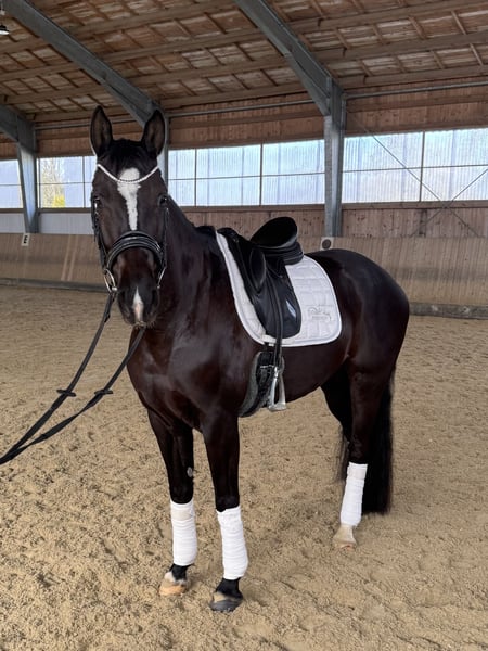 Wiwi is a spirited 9-year-old black mare by Pacelli W out of Walt Disney I. She stands approximately 16.1 hh but is very well-built and capable of covering a lot of ground. She is not suitable for beginner riders or less experienced equestrians. Wiwi is eager to be ridden and requires a confident, consistent rider from above to ensure her best performance. So far, she has been primarily trained in dressage and is currently competing at A-level. In handling, she is straightforward and uncomplicated. She is familiar with both open stable and (paddock) box housing. I am selling her with a heavy heart and am looking for a 5-star home with a family environment. If my black beauty appeals to you, I am happy to send more information via WhatsApp. Videos available upon request.