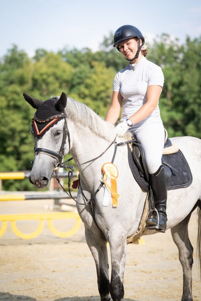 Berry to 9-letnia siwa klacz od Cool Man K x Clerus. Zdobyła zwycięstwa w skokach przez przeszkody kategorii M oraz odnosiła sukcesy w ujeżdżeniu klasy A i w konkurencji wszechstronnej. Jej pasją są skoki przez przeszkody, gdzie zachwyca doskonałą ujeżdżalnością i sportowym podejściem… widać, jak czerpie radość z jazdy przez parkur. Na co dzień jeździ na zwykłej wodzy i bez użycia sporen, wyłącznie pod opieką moich dwójki dzieci (13 i 17 lat). W obejściu jest spokojna i łatwa w obsłudze, spokojnie znosi czyszczenie, jest przyjazna wobec czapraka i pewna na terenie. Hodowana jest u nas w boksie i na padoku, przez cały rok wypasa się na wspólnej pastwisku z inną grupą koni. To koń o dużym potencjale i rozsądku, idealny dla ambitnego jeźdźca poszukującego sportowego konia gotowego do jazdy od razu. Chętnie udzielę więcej informacji i prześlę filmy na życzenie. Kontakt: 0160 / 360 35 13