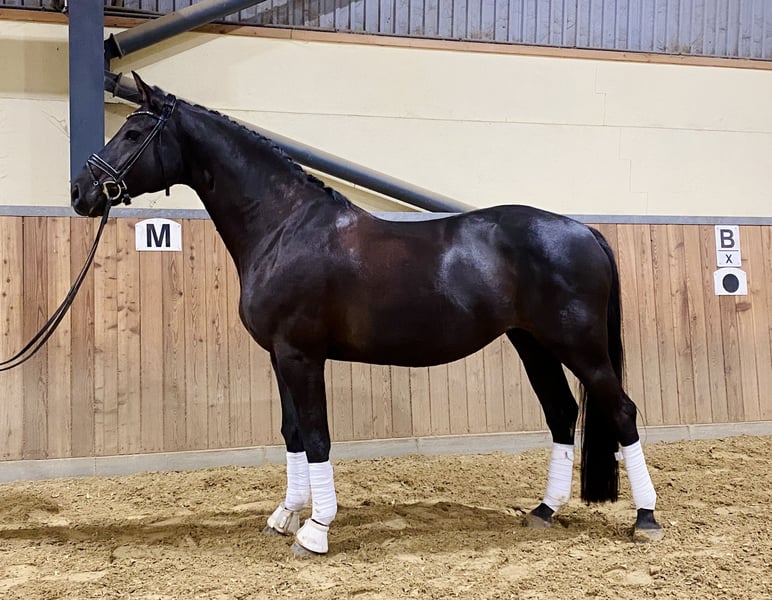 For sale is a mare born in 2016 with a height of 167 cm. Violet has three very good basic gaits and has been trained in dressage with us. She has been presented by me at competitions in the E and A dressage levels. Initial L-level lessons have been started in training, where she has shown a strong willingness to learn. In free jumping, Violet demonstrated a nice jump, although jumping under saddle has not been further developed by us. However, she is familiar with pole work, in which she participated with motivation. With an experienced horse, Violet shows reliability in the terrain, even on longer distances. She also enjoys groundwork, as she is very curious and eager to learn. In unfamiliar environments, Violet requires an experienced rider who can provide her with security. We would wish for Violet to have a strong rider who knows how to assert themselves in case of doubt. Her father Viscount passed on his elegance and powerful presence to her. Her mother comes from an old DDR mare line, which makes Violet potentially interesting for breeding as well. A good veterinary check from 07/2022 with X-rays is available. If interested, the saddle can be purchased as well.
