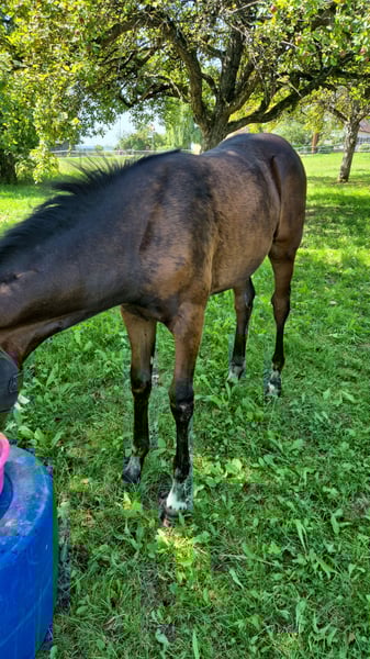 bildschönes, langbeiniges und im größeren Rahmen stehendes Stutfohlen von Duplexx mit weiblich, charmantem Gesicht. Die Mutter des Fohlens ist eine doppelt veranlagte Leistungsstute Springen, die selbst mit junger Amazone bis S-Springen erfolgreich war und bereits einen S-siegreichen Sohn hat. Der Vater Duplexx, einer der wenigen Hengste, die sowohl im Springen bis Klasse S als auch in der Dressur bis S erfolgreich ist und auch in der Vielseitigkeit bereits 5 jährig Vizebundeschampion war. VV: Diarado - seinerzeit Siegerhengst seiner Körung - stellte mehr als 50 1.60 Meter-Parcours-Pferde. Über die Mutterseite führt er Heraldik XX, der mit Abstand der beste Zucht-Vollbluthengst war. Im Springen und in der Dressur produzierte er mehrere Grand-Prix Pferde. Auch der Muttervater Werther war ein bedeutender Vererber in der Springpferde- und Dressurpferdezucht. "Der Stamm der alles kann" heißt es bis heute noch. Seine Tochter Werra z.b. zählte unter Nick Skelton zu den erfolgreichsten Springpferden ihrer Zeit. Auch bedeutend in der Mutterlinie der Hengst Graphit, dessen bekanntester Nachkomme King Edward Gold bei den olympischen Spiele in Tokio und bei den Weltmeisterschaften in Herning gewann. Das Fohlen selbst ist sehr gut erzogen und dem Menschen zugewandt. In schöner dunkelbrauner Jacke genießt sie die täglichen Putz- und Streicheleinheiten. Sie kennt den Hufschmied bereits sehr gut - gibt ihre Hufe von alleine, kennt es brav am Strick zu laufen und angebunden zu werden und auch eine Decke lässt sie bereits brav anziehen. Wer ein für die Vielseitigkeit interessantes Fohlen sucht findet hier genau das richtige. Eventuell können wir uns auch vorstellen das Fohlen zur Verfügung zu stellen - wenn der Platz passt.