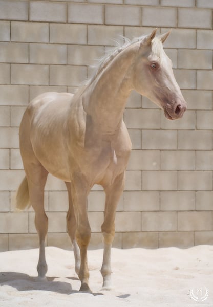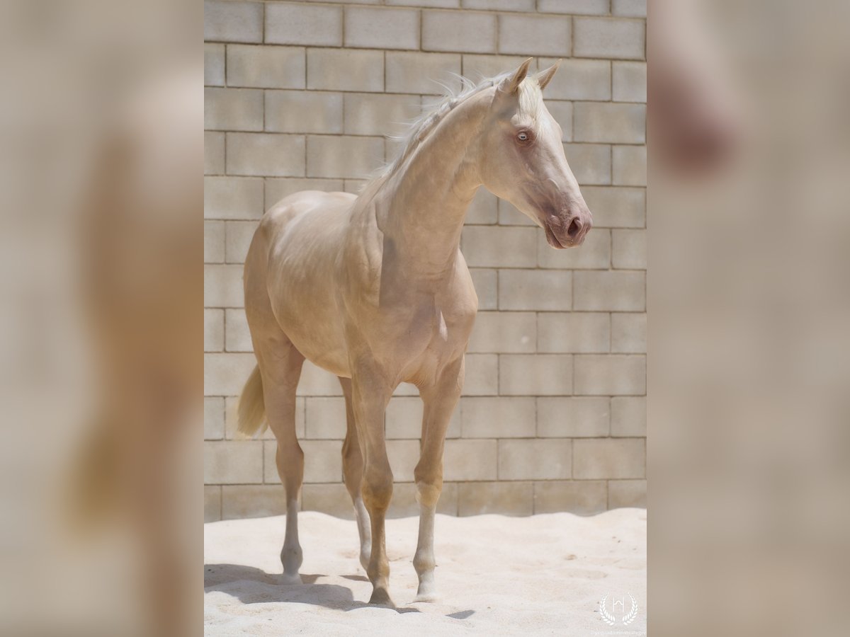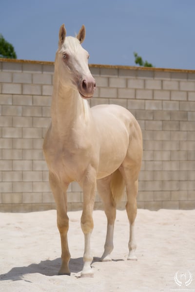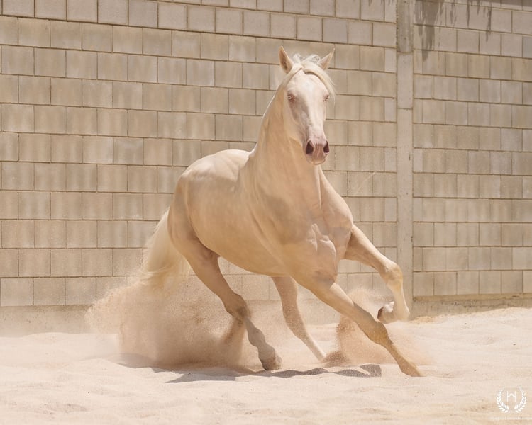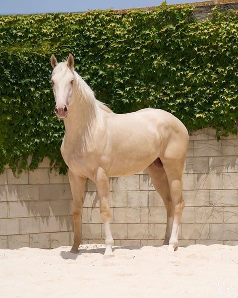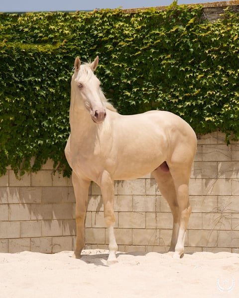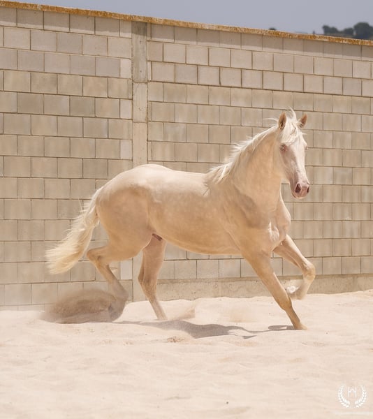 📅 21/04/2023 – CDE registered with ANCADES 🐴 A unique and exceptionally beautiful cremello colt, harmonious and powerful, with three high white socks and sky-blue eyes. Current height: 1.70 m | Expected final height: 1.72 m – 1.75 m Three-white cremello, blonde mane and tail | Excellent conformation, strong back, prominent withers and explosive movement. 🧬 Elite genetics Son of Quest of Gold (palomino CDE) – Las Regueras bloodline Grandson of Quatercream IE x Quarterback | Granddam: Eva, Polish palomino warmblood Cremello genetics (ee CRCR) GUARANTEES → 100% dilute-coloured offspring • With solid mares: palomino, buckskin, smoky black • With dilute mares: cremello, perlino, smoky cream 🧠 Excellent character & handling Basic training: lunging in all three gaits, both reins Easy to handle, good for the farrier, loads and travels well Entire colt with a calm, social and adaptable temperament – never covered 🎯 Versatility & movement Ideal for dressage, show jumping or sport use Big, elastic gaits with good projection A functional young horse with presence, balance and natural nobility ✅ Health guaranteed Excellent pre-purchase X-rays | Veterinary examinations accepted ✈️ National and international transport with professional companies. 📲 Direct contact: +34 639 522 420 📷 Photography: @almarevisual