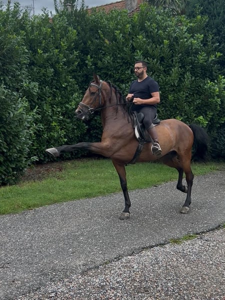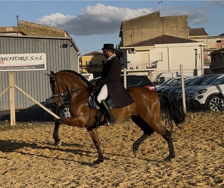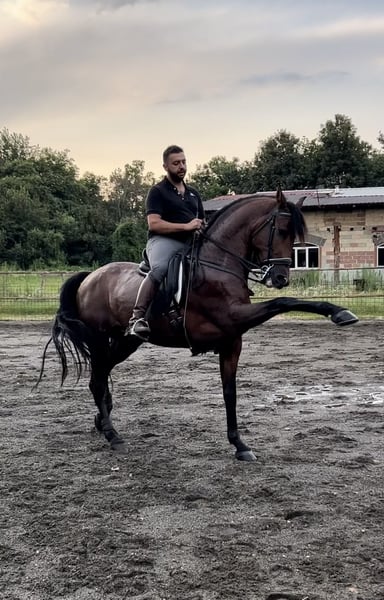 Castrone P.r.e anni 10 domato in alta scuola spagnola , piaffe passage passo spagnolo jambet revers travers cambi di galoppo appoggi ecc, cavallo dí facilissima gestione da terra e super affidabile, montato per persone con minimo di esperienza, non per principianti .0039 3331377815