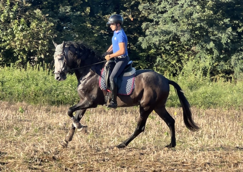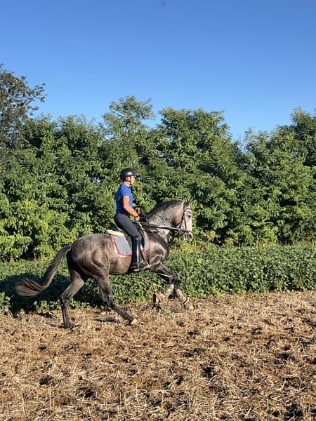 CDE (Spanish Sport Horse), a cross between PRE and Holsteiner, with purebred documentation. He is 10 years old, gelded, and stands at 16.1 hh at the withers. He has an excellent conformation, an impressive presence, and a very gentle, playful, and well-trained demeanor up to M/D level. He has competed successfully in FISE competitions. He performs shoulder-in, half-pass, pirouettes at walk and canter, simple and flying changes, including series (up to two tempi). Easy to handle with bridle and bit, suitable for hacking, making him ideal for amateurs or those learning. Available for any test or inspection.