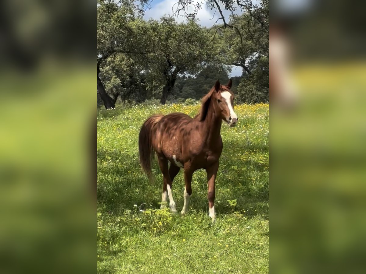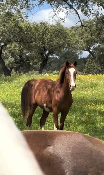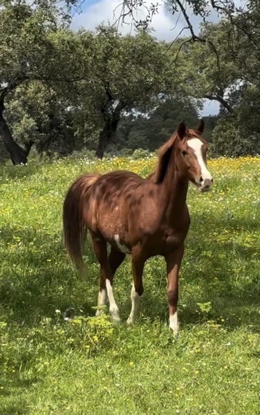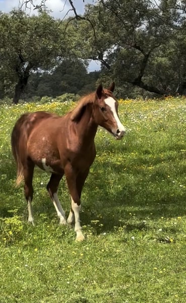 This is a 2.5-year-old filly, granddaughter of SANTANO. She is incredibly gentle and has been treated with love and respect since birth. She has been in my hands since she was 9 months old and is very well handled; she allows everything. I have taken her on walks in the fields of Ramal, and I have even trimmed her hooves myself, so now the farrier can work on her loose and without any issues. She is also very friendly with the veterinarian. Completely clean, she is not only beautiful but also has an incredible physique and movement. Her temperament is very sweet. There are photos and videos of her from when she was a foal up to now. In two weeks, I will upload new videos and pictures. If you are interested, please contact me. Our priority is to find her a good home, so we might be willing to negotiate the price a bit. She is a chestnut, but her markings resemble those of a paint horse, inherited from her sire. She has a distinctive eagle-shaped mark on her belly.
