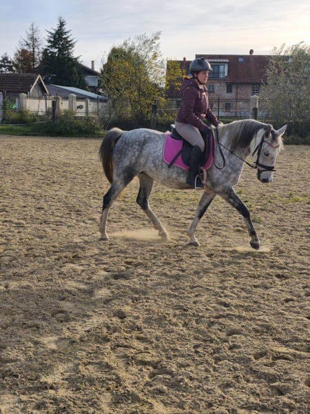 If everything fits, I am offering my 9-year-old grey mare, Milla. She is very well-behaved in handling, does not kick or bite. In the herd, she tends to be relatively high-ranking and is barefoot. Over the past two years, she has mostly been ridden in groups or as a second horse on trail rides, and she is very calm in all three gaits. Sometimes a bit watchful, but not spooky. If something seems unfamiliar to her, she will stop and observe. She is always manageable on the ground. We haven't been out alone. In the riding arena or indoor school, she can be a bit tricky to ride; she has had some bad experiences there in the past, which sometimes causes her to act up or become a bit more spirited. However, she learns very quickly when you work with her consistently. She is never mean, and she does not buck or rear. Overall, she is a spirited horse that enjoys moving and I could very well imagine her on trail rides. Not suitable for beginners! The dressage saddle, which was fitted by the saddle fitter, and her blankets are included. I am looking for a wonderful home where there is enough time to dedicate to her.