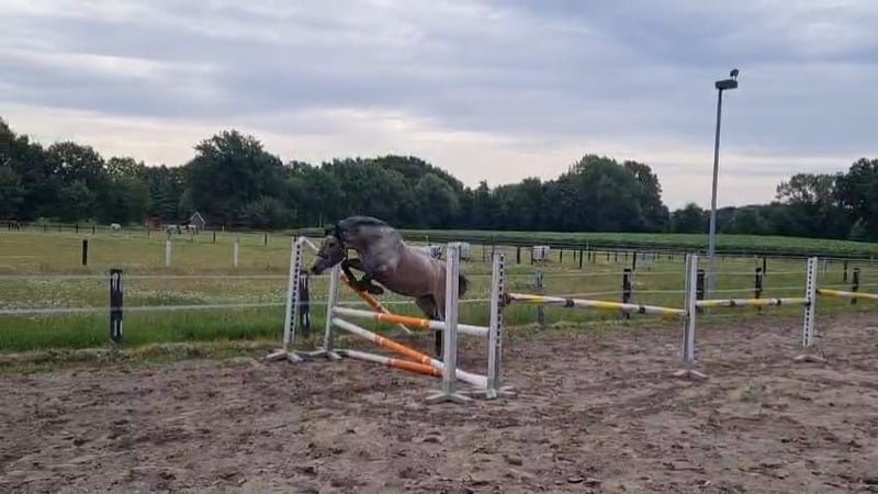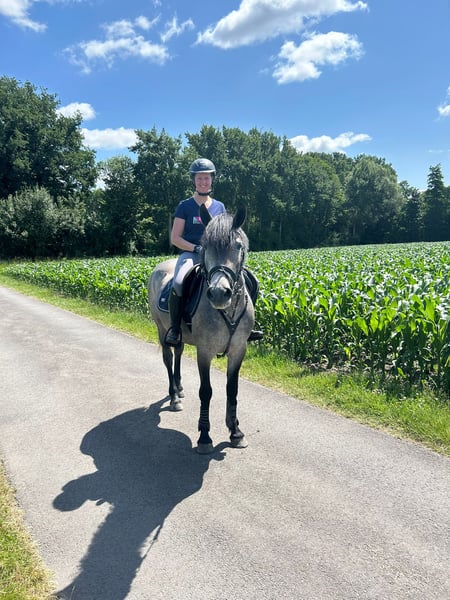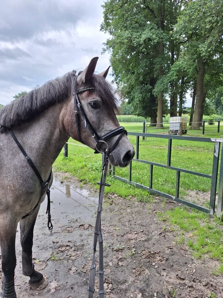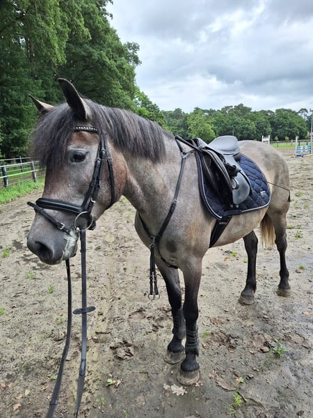 For sale is a 5-year-old Hungarian pony mare. Miranda is approximately 147 cm tall and accommodates larger riders well with her strong build. She confidently moves in all three gaits, is familiar with lunging and trail rides. Miranda is a very relaxed and uncomplicated type and is hardly disturbed. Occasionally, she shows her mare-like behavior while grooming (tail lifting), which is why we would not sell her as a purely beginner pony. When ridden, she shows no bad habits. With us, she has been ridden by three different people, so we can also imagine her in a school setting. Children have already sat on her without any issues. She behaves very well in the field. She is very comfortable in the trot and can be easily placed on the bit. In the gallop, the connection still needs to be further developed. In free jumping, she shows a good jump. Due to time constraints, she has not been further trained in jumping so far. However, we believe that with proper training, she would excel in show jumping. Loading onto a trailer and farrier visits are no problem. Miranda has been regularly dewormed. If you are interested, we would be happy to arrange an appointment for you to get to know Miranda. We charge a fee of €15 for a trial ride, which will, of course, be credited towards the purchase. Equipment can be included for an additional cost.