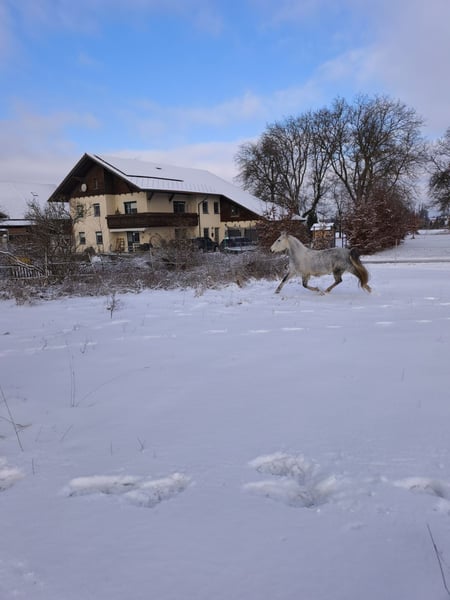 Suche für meine hübsche 9-jährige Schimmelstute Milla ein schönes neues Zuhause. Sie ist ca. 150cm groß und ist im Umgang super brav, schlägt und beißt nicht. In der Herde ist sie eher ranghoch und barhuf unterwegs. Milla wurde die letzten zwei Jahre fast nur in der Gruppe/Zweitpferd im Gelände geritten, hier ist sie in allen drei Gangarten sehr brav. Ist ihr etwas nicht geheuer, bleibt sie stehen und schaut. Sie ist immer händelbar. Alleine waren wir nicht draußen. Auf dem Reitplatz bzw Halle ist sie nicht ganz einfach zu reiten, sie hat hier früher mal schlechte Erfahrungen gemacht und zickt deshalb manchmal oder wird etwas flotter. Sie lernt aber sehr schnell, wenn man sich ausreichend mit ihr beschäftigt. Sie wird nie böse, bockt und steigt nicht. Sie ist generell ein Pferd mit Go und viel Energie, das sich gern bewegt. Könnte sie mir gut auf Wanderritten vorstellen. Kein Anfängerpferd! Der Dressursattel, der von der Sattlerin angepasst wurde und ihre Decken wären dabei. Ich suche für sie ein tolles Zuhause, wo man ausreichend Zeit für sie hat. Sie steht in Schärding, Oberösterreich
