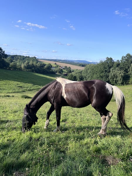 I am looking for a loving home for my dear gelding Vikram, affectionately called “Viky,” where he will be cared for with kindness and where his gentle nature can bring joy to a caring person. Unfortunately, I cannot provide him with the optimal conditions he needs in our stable, so I am seeking a new home for him. I am happy to share more details personally. Viky is a gaited horse, meaning he tölt. His breed is unknown to me; he comes from the Forgotten Horses Farm Ireland and has a regular equine passport. He is simply an angel in character. He loads into the trailer on his own, is very cautious around humans, and highly sensitive. He is very courageous; I have worked with him, including fire training, and last summer, I competed with him at a knight’s tournament. However, there is one caveat. He is rideable but occasionally has issues with his hindquarters. Veterinary examinations have revealed no underlying problems. With proper muscle development and moderate workload, he copes well. My suspicion is that he was quite driven as a sport horse in Ireland, which might have led to his current situation, and he ended up at the Horse Protection Farm. His issues are reflected in some stiffness and uneven gait. I am happy to explain and discuss this in person as well. In the herd, he ranks low and tends to be more of a loner. He handles walks and rides alone without any problems. He is truly a wonderful companion for someone who enjoys ground work, walks, and mostly recreational riding. From the ground, I could also see him as a therapeutic partner because he is very cautious and well-mannered. I wish for him a loving home where he can settle in and enjoy a relaxed life. He will not be sold to dealers or riding schools. Preferably, he should be kept in a stable with a 12/12 turnout or paddock. He needs to be able to move freely in any case. Currently located in the Czech Republic. Transportation can be arranged. Regarding his breed: I selected “other breeds” as an option. His Irish Sporthorse background is only a guess; nothing is registered in his passport.