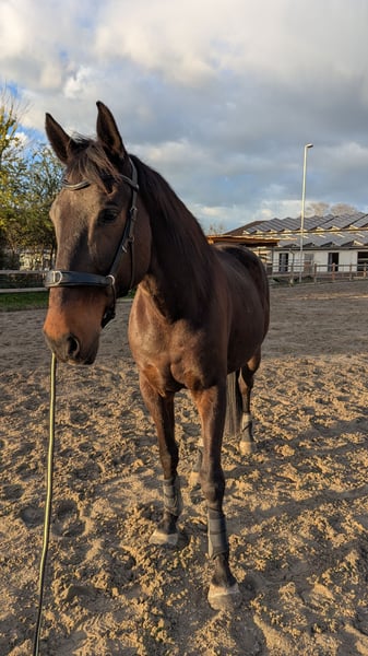 People-oriented, intelligent gelding seeking a permanent home Diamond is an 11-year-old Irish Sport Horse gelding, standing approximately 16.1 hh. He is very affectionate towards people and enjoys interaction and attention. He feels most comfortable and has the most fun in the outdoor environment. An excellent adventure buddy! He is well-behaved under saddle on the arena, though riding there is not his favorite activity. He enjoys groundwork and makes an effort to respond to commands. His playful personality makes him a joy to be around—a real charmer. He is best suited for one or two riders; he does not get along well with changing handlers or riders. He requires turnout in a pasture with a herd. Keeping him stabled, even with turnout, tends to make him anxious and easily spooked. In a harmonious herd environment, these issues are not noticeable. Currently, he is shod with oil-lathed shoes on all four feet. I have also previously kept him barefoot at the back. However, due to the hard surfaces in the turnout, he quickly wears down his hooves and becomes tender-footed. He has developed equine asthma and shows two minor arthritic changes, which do not limit him. The asthma is currently moderate. With an appropriate stable environment, it should be manageable, and he will likely become symptom-free. I am offering him for sale because I cannot find a suitable stable nearby that can accommodate his asthma, as he tends to start coughing and produce some mucus periodically. He is vaccinated against tetanus and regularly dewormed. Further detailed information is available by phone. We also welcome a personal visit. I have grown very fond of him and wish for him to find a home where he can settle in and fully express his wonderful personality. Not a rescue sale; no riding schools or dealers. Accessories: Inhaler, rain, fly, and cooling sheets, halter, bridle, bitless bridle, etc., can be purchased with him.