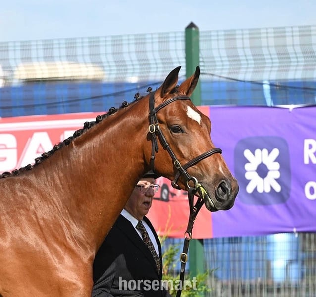 2023 kasztanowy ogier | około 16 hh – przewidywana końcowa wysokość poniżej 16,3 hh Ojciec: Vivant van de Heffinck Matka: Frisco Chacoa (by Chacoa) Jeśli szukasz młodego konia z klasą, krwią (ponad 50% wyścigowa) i obecnością, nie szukaj dalej niż Redwood Phoenix. „Hugo” to poważnie zwracający uwagę kasztanowy ogier z 2023 roku, łączący najlepsze kontynentalne linie sportowe z najwyższej jakości irlandzkim rodowodem. Po wyjątkowym Vivant van de Heffinck, ojcu niezliczonych międzynarodowych skoczków, oraz po Frisco Chacoa (by Chacoa), rodowód Phoenix mówi sam za siebie. Linia matki obejmuje pokolenia sprawdzonych linii hodowlanych — Puissances Clover (by Puissance) i Clover Hill — zapewniając mu wysoką jakość, zakres i temperament, które pozwolą mu odnieść sukces w każdej dyscyplinie. Phoenix już zyskał uznanie na ringach pokazowych — najważniejsze osiągnięcia to: Royal Highland Show (Juniorek): 1 miejsce w klasie i Wiceczempion Sportowego Konia – ogromny sukces dla młodego konia. Royal Highland Show ( Dwulatki): 1 miejsce w klasie. Co. Antrim Show: 1 miejsce w klasie i Wiceczempion. To pięknie zbudowany, atletyczny i energiczny młody koń, który przyciąga uwagę wszędzie, gdzie się pojawi. Prosty, rozsądny i bardzo sympatyczny – Hugo jest łatwy we wszystkim i spokojnie stoi na kucni u kowala. Szczepienia i odrobaczanie są aktualne. Dzięki swojemu rodowodowi, nastawieniu i naturalnej prezencji Redwood Phoenix to poważny kandydat na przyszłość — niezależnie od tego, czy Twoje ambicje kierują się ku skokom przez przeszkody, ujeżdżeniu czy pokazom. Prawdziwa gwiazda w powstawaniu. Wszystko do obejrzenia na miejscu, jeśli możesz przyjechać na stadninę. Zlokalizowany w Co. Down. Wysyłka na cały świat, prosimy o kontakt w celu wyceny. Cena 11 000 funtów brytyjskich w dniu sprzedaży. Red DKP