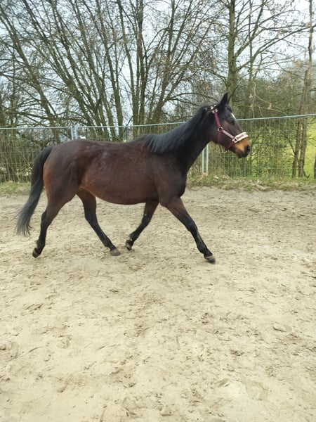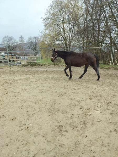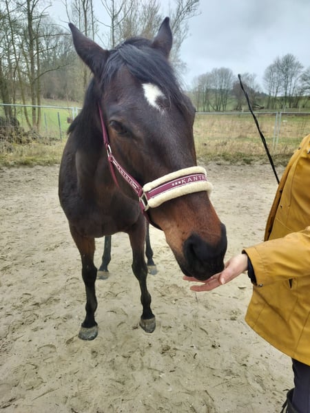 Listed for a friend. Sweet, affectionate mare. Well-behaved in handling, forging and loading are no problem. Lower in the hierarchy, lives in an open stable. Has been used for breeding in the past; overall, she has been ridden three times. She is a self-starter with good potential. With further training, she will surely become a lovely leisure horse. Not spooky. Unfortunately, she is currently poorly muscled. A drawback: she weaves in the stable but not in the pasture. Regrettably, due to personal reasons, she is being sold into good hands.