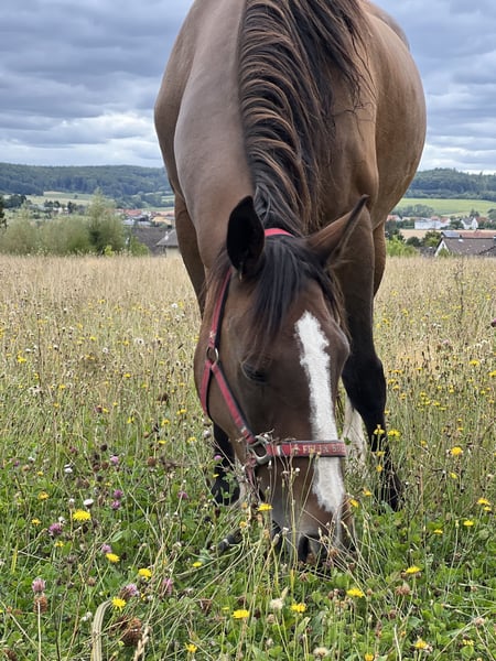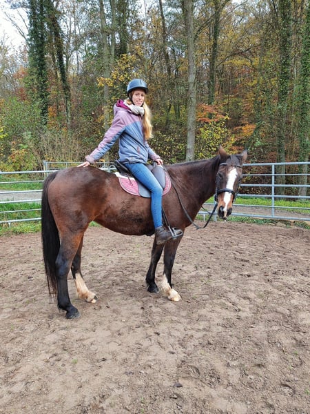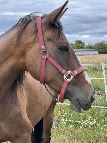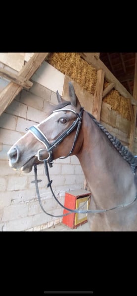 Offered here is a mare, born in 2012, bay, standing at 160 cm, healthy for sale. She is very people-oriented and loves to cuddle. She enjoys groundwork and is always attentive, with very nice, expressive gaits. The mare is very well-behaved in handling, loads well onto a trailer, is easy to groom, saddle, and can be taken away alone; the farrier is no problem at all. On the lunge, she performs all three gaits flawlessly, is very sensitive, and responds well to voice commands. She shows jumping ambitions, enjoys groundwork and gymnastic exercises, and needs further development as she has a lot of potential and wants to please! Unfortunately, she seems to have had very bad experiences during her initial training and can only be ridden by experienced, confident riders. (Then she can be ridden well.) She is initially anxious when mounting. She has already been in training twice. Unfortunately, I do not have the necessary time to do justice to her training. Therefore, I am looking for an experienced rider who can invest time in her training. She has also had a foal before, making her interesting as a breeding mare (white papers). She needs a place where she can continue to be developed. She will not be sold to beginners or re-riders. For more details, pictures, videos, etc., feel free to contact me via private message or arrange a meeting.