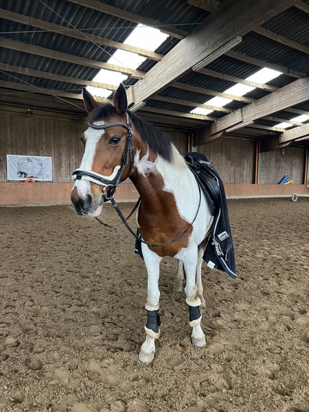 Miss Dakota, a 15-year-old mare, is a gentle, affectionate horse seeking a new, suitable home. She is very people-oriented and reliable in daily handling. In groundwork and lunging, she works attentively and with enthusiasm, always easy to handle. She is also a trustworthy partner in the field, riding calmly and well-behaved in a group setting. Under saddle, Miss Dakota requires a consistent, clear leadership. She is not suitable for children or beginners, as she needs a confident, experienced rider who can give her guidance. With the right person by her side, she can showcase her full potential and brings great joy to riding. She particularly thrives over fences, displaying enthusiasm and talent. Miss Dakota is a loyal, motivated mare with a big heart, looking for a partner who understands and nurtures her. Her saddle is currently being sold, so a trial ride without a saddle is only possible at the moment. She will be sold with various accessories. She is 15 years old and measures 1.57 meters at the withers. This is not a desperate sale; I am looking for a loving home where she will be appreciated and valued. If interested or if you have any questions, please feel free to contact me.