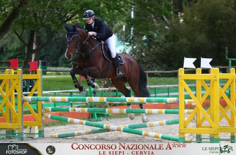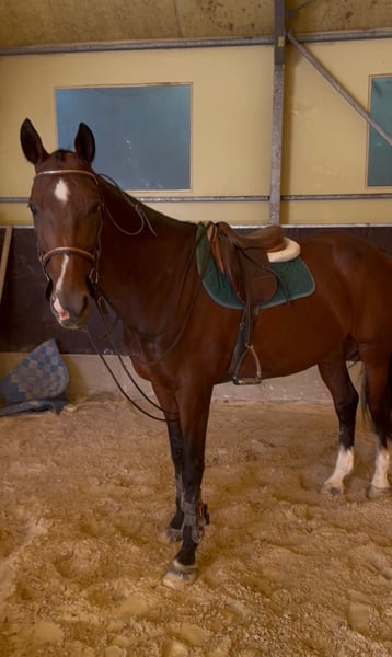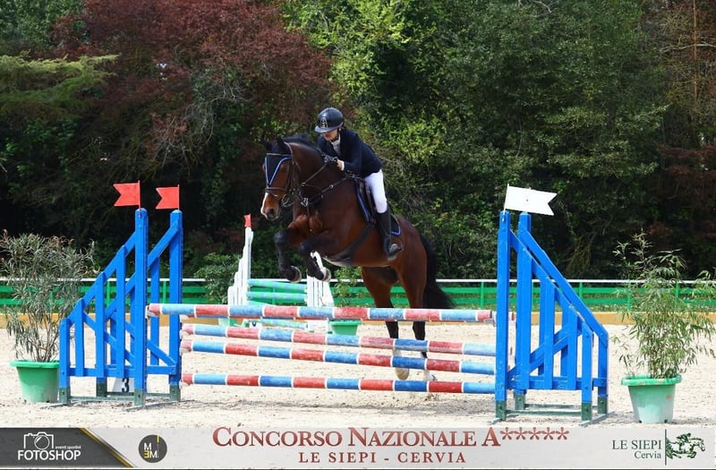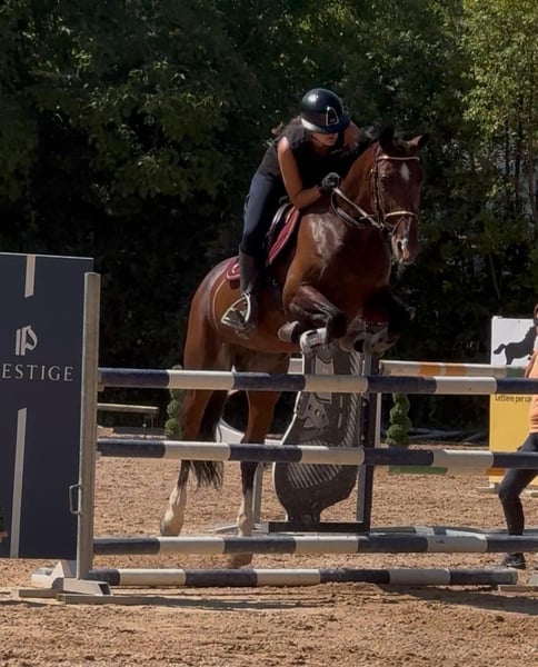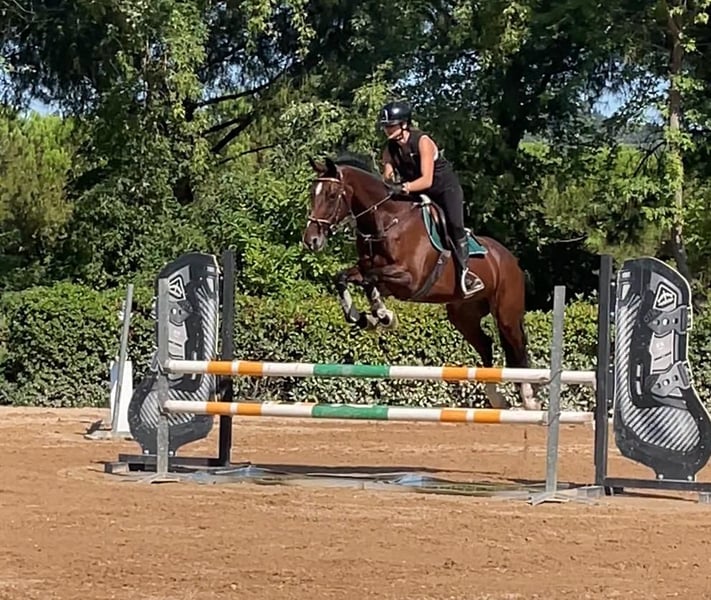 Selling mare. Born in Ireland in 2008. Sire: Creevagh Ferro Dam: Vendetta D'Aulne Grandfather (paternal): Ferro Grandmother (maternal): Quintus Height: 16.1 hh Color: bay Two hind stockings Always in good health. Previous experience in international eventing competitions (jumping 130 cm). Recent years, competed in show jumping and dressage in Italy. Currently suitable for categories up to 100 cm, dressage. Excellent temperament, very good with other horses. Calm in the countryside and during transport. Regular work on the flat; tends to warm up over jumps but remains responsive. Indicative price: €4,500