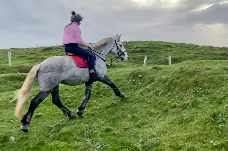 Heather is currently a 15.9 hh Irish Draught mare. She is expected to grow a bit more. As is typical for her breed, she has a solid foundation and is well-suited for larger riders. Heather is robust and versatile in her use. She came directly from her breeder to us. Last year, she was gently backed and has only been ridden in the countryside. As seen in the photos, she comes straight from the coast and was regularly ridden along the sea. :-) Since arriving with us, Heather has been trained in dressage in an indoor arena. She has three good, solid gaits and is easy to sit. Contrary to what one might expect, Heather is very light on the aids. Her character is truly exceptional—she is such a sweet and uncomplicated mare. Heather is truly charming; Irish Draughts are simply such cool and resilient horses. We are continually impressed. Heather is an all-rounder, and yes, she also jumps well. ;-) For more information, we look forward to your call at: 0177/2721831. If you're interested in videos, please contact us directly via WhatsApp. :-)