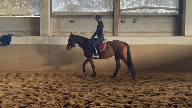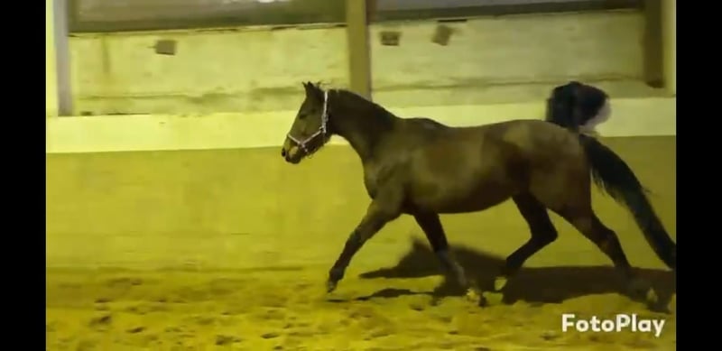 Keira is a very gentle, refined mare that is currently with us for training and will be available for sale. She is a one-person horse, enjoys the company of children, and gets along well in a mixed herd. We have introduced her calmly and gradually to saddle training, and she now rides in all three basic gaits. Due to weather conditions, she has so far only been ridden indoors. Keira is NOT suitable for beginners and is not recommended for nervous riders. She does not tolerate rider errors well. She requires a calm, sensitive, and confident rider. If you would like to get to know her, please contact us via WhatsApp or call us at 01639129382.