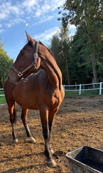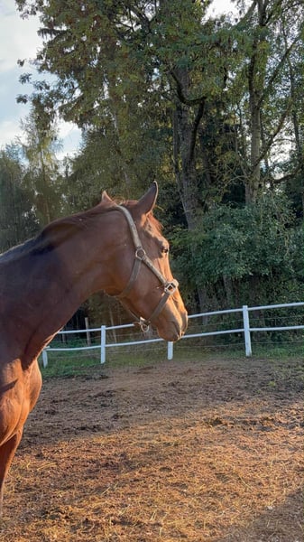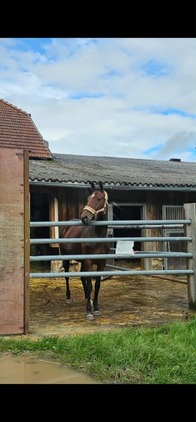 Caillin is a 6-year-old Irish Sport Horse with quite a bit of experience under her belt. She has been ridden and has jumped quite high, always very reliable and well-behaved. She has also been ridden and jumped in the field and at the arena by children. In handling, she is completely free of vices, very sweet and friendly! A very calm and mature 6-year-old. However, she was surrendered due to an injury and has ended up with us. We are doing our best to keep her healthy and are on the right track! Unfortunately, her future will not involve returning to competitive sport. She is still in the healing process, so she is being offered at a favorable price due to her current condition. We are looking for a home as a broodmare, companion, or potentially as a leisure partner in the future. Further information gladly upon request!